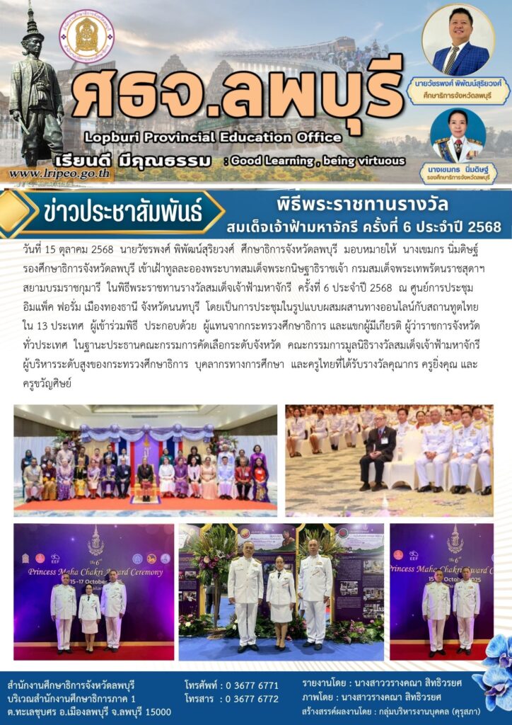 วันที่ 15 ตุลาคม 2568 นายวัชรพงศ์ พิพัฒน์สุริยวงศ์ ศึกษาธิการจังหวัดลพบุรี มอบหมายให้ นางเขมกร นิ่มดิษฐ์ รองศึกษาธิการจังหวัดลพบุรี เข้าเฝ้าทูลละอองพระบาทสมเด็จพระกนิษฐาธิราชเจ้า กรมสมเด็จพระเทพรัตนราชสุดาฯ สยามบรมราชกุมารี ในพิธีพระราชทานรางวัลสมเด็จเจ้าฟ้ามหาจักรี ครั้งที่ 6 ประจำปี 2568 ณ ศูนย์การประชุมอิมแพ็ค ฟอรั่ม เมืองทองธานี จังหวัดนนทบุรี โดยเป็นการประชุมในรูปแบบผสมผสานทางออนไลน์กับสถานทูตไทย ใน 13 ประเทศ ผู้เข้าร่วมพิธี ประกอบด้วย ผู้แทนจากกระทรวงศึกษาธิการ และแขกผู้มีเกียรติ ผู้ว่าราชการจังหวัดทั่วประเทศ ในฐานะประธานคณะกรรมการคัดเลือกระดับจังหวัด คณะกรรมการมูลนิธิรางวัลสมเด็จเจ้าฟ้ามหาจักรี ผู้บริหารระดับสูงของกระทรวงศึกษาธิการ บุคลากรทางการศึกษา และครูไทยที่ได้รับรางวัลคุณากร ครูยิ่งคุณ และครูขวัญศิษย์