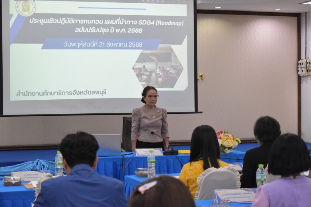 วันที่ 21 สิงหาคม 2568 นายวัชรพงศ์ พิพัฒน์สุริยวงศ์ ศึกษาธิการจังหวัดลพบุรี มอบหมายให้ นางเขมกร นิ่มดิษฐ์ รองศึกษาธิการจังหวัดลพบุรี ปฏิบัติหน้าที่แทน ประธานเปิดการประชุมเชิงปฏิบัติการทบทวนแผนที่นำทาง SDG4 (Roadmap) ฉบับปรับปรุง ปี พ.ศ. 2568 ตามโครงการติดตามความก้าวหน้าการบรรลุเป้าหมายการพัฒนาที่ยั่งยืนด้านการศึกษา (SDG4) และพัฒนาฐานข้อมูลเพื่อการพัฒนาที่ยั่งยืนด้านการศึกษา (SDG4) ประจำปีงบประมาณ พ.ศ.2568 ณ ห้องประชุมละโว้ สำนักงานศึกษาธิการภาค 1 ดำเนินงานโดย กลุ่มนโยบายและแผน (ศธจ.ลพบุรี)