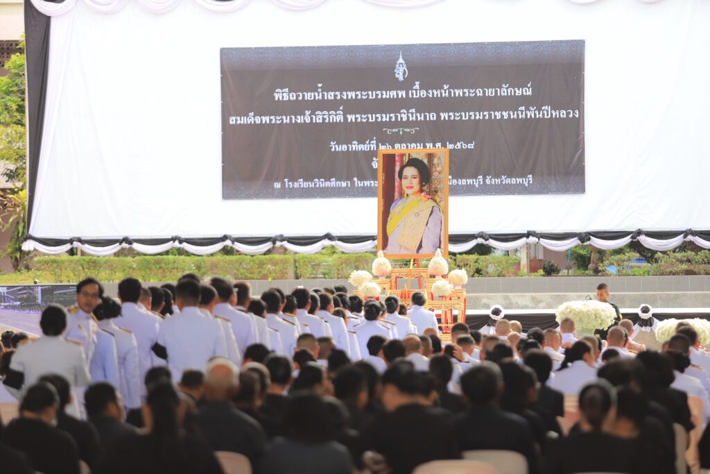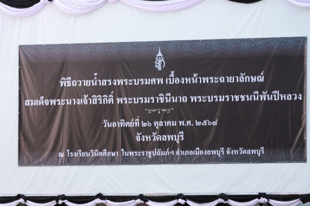 วันอาทิตย์ที่ 26 ตุลาคม 2568 นายปรัชญา เปปะตัง รองผู้ว่าราชการจังหวัด รักษาราชการแทน ผู้ว่าราชการจังหวัดลพบุรี ประธานในพิธีฯ นำหัวหน้าส่วนราชการ ภาครัฐ ภาคเอกชน และพสกนิกรทุกหมู่เหล่า เข้าถวายน้ำสรงพระบรมศพ เบื้องหน้าพระฉายาลักษณ์ สมเด็จพระนางเจ้าสิริกิติ์ พระบรมราชินีนาถ พระบรมราชชนนีพันปีหลวง ณ บริเวณอาคารอเนกประสงค์ (โดม) โรงเรียนวินิตศึกษา ในพระราชูปถัมภ์ ฯ อำเภอเมืองลพบุรี จังหวัดลพบุรี ในการนี้ นายวัชรพงศ์ พิพัฒน์สุริยวงศ์ ศึกษาธิการจังหวัดลพบุรี มอบหมายให้ นางเขมกร นิ่มดิษฐ์ รองศึกษาธิการจังหวัดลพบุรี เข้าร่วมพิธีดังกล่าว