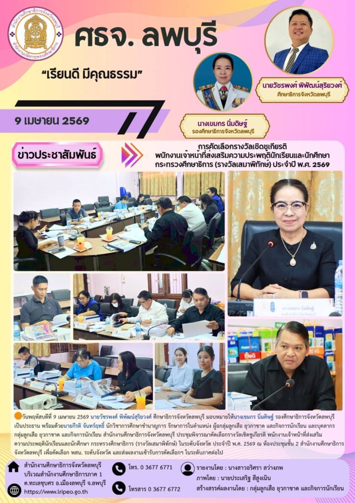 🟠วันพฤหัสบดีที่ 9 เมษายน 2569 นายวัชรพงศ์ พิพัฒน์สุริยวงศ์ ศึกษาธิการจังหวัดลพบุรี มอบหมายให้นางเขมกร นิ่มดิษฐ์ รองศึกษาธิการจังหวัดลพบุรี เป็นประธาน พร้อมด้วยนายกีรติ จันทร์ฤทธิ์ นักวิชาการศึกษาชำนาญการ รักษาการในตำแหน่ง ผอ.กลุ่มลูกเสือ ยุวกาชาด และกิจการนักเรียน และบุคลากรกลุ่มลูกเสือ ยุวกาชาด และกิจการนักเรียน สำนักงานศึกษาธิการจังหวัดลพบุรี ประชุมพิจารณาคัดเลือกรางวัลเชิดชูเกียรติ พนักงานเจ้าหน้าที่ส่งเสริมความประพฤตินักเรียนและนักศึกษา กระทรวงศึกษาธิการ (รางวัลเสมาพิทักษ์) ในระดับจังหวัด ประจำปี พ.ศ. 2569