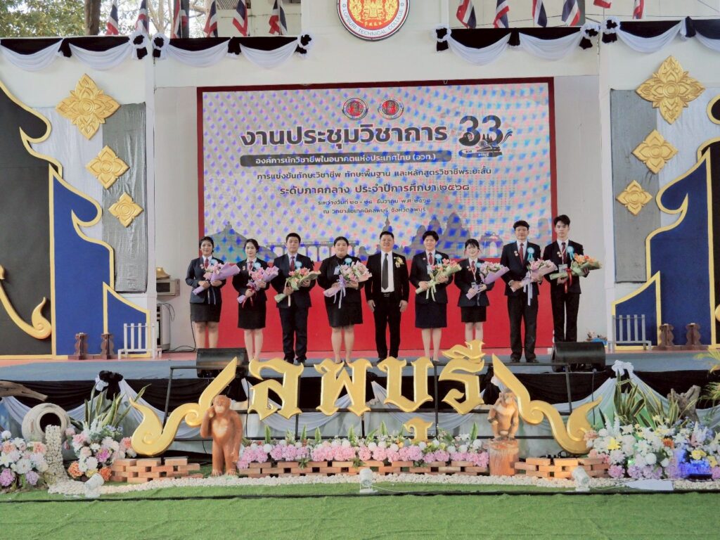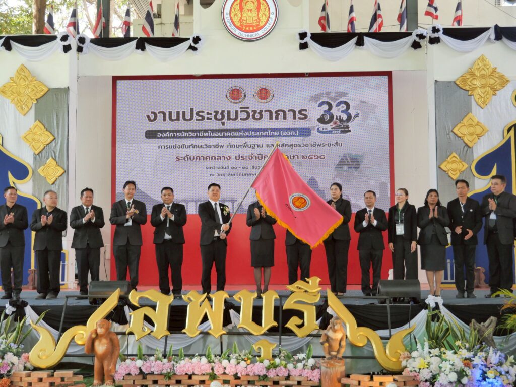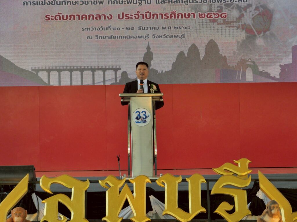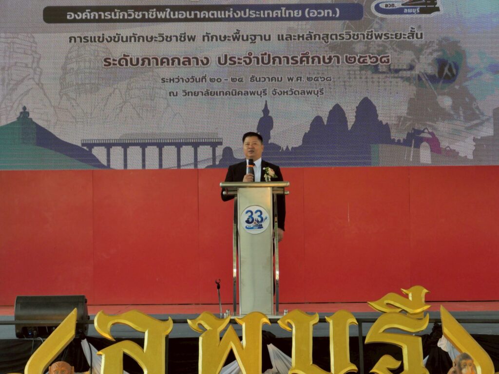 วันพุธที่ 24 ธันวาคม 2568 นายวัชรพงศ์ พิพัฒน์สุริยวงศ์ ศึกษาธิการจังหวัดลพบุรี ประธานพิธีปิดงานประชุมวิชาการองค์การนักวิชาชีพในอนาคตแห่งประเทศไทย (อวท.) การแข่งขันทักษะวิชาชีพ ทักษะพื้นฐาน และหลักสูตรวิชาชีพระยะสั้น ระดับภาคกลาง ครั้งที่ 33 ประจำปีการศึกษา 2568 และมอบโล่รางวัล ณ วิทยาลัยเทคนิคลพบุรี จังหวัดลพบุรี