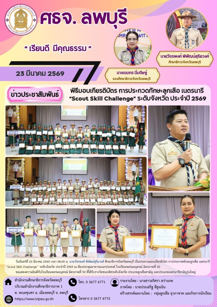 🐯วันจันทร์ที่ 23 มีนาคม 2569 เวลา 08.00 น. นายวัชรพงศ์ พิพัฒน์สุริยวงศ์ ศึกษาธิการจังหวัดลพบุรี เป็นประธานมอบเกียรติบัตร การประกวดทักษะลูกเสือ เนตรนารี “Scout Skill Challenge” ระดับจังหวัด ประจำปี 2569 ณ ห้องประชุมอาคารอเนกประสงค์ โรงเรียนพลร่มอนุสรณ์ มิตรภาพที่ 50